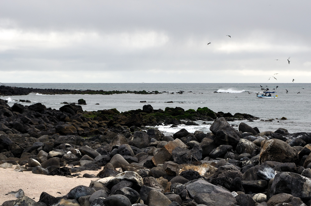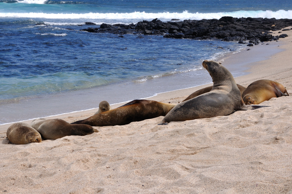 Nach dem Ecuadorianischem Festland bin ich für eine Woche auf die Galapagos Insel San Cristobal, um die 1000 km im Pazifik. So weit draussen im Pazifik war es dann etwas kühler. In Puerto Baquerizo Moreno fand ich eine einfache, bezahlbare Unterkunft. Zum Surfen und schnorcheln war ich die meiste Zeit in Loberia, ein auf der Insel südlich gelegener Strand zwischen den ganzen Lavabrocken. Das Riff zum Surfen ragt recht weit aus dem Wasser und die Wellen kommen aus dem tiefen ozean, herausfordernder Spaß, bei kleinem Swell. Die Tierwelt ist wirklich außergewöhnlich und recht zutraulich. Über die Echesen und Seehunde stolpert man förmlich, Seevögel und Darwinfinken finden sich auch reichlich. Ausserdem hat es jede menge Schildkröten im Wasser. Ich hatte eine meiner schönsten Schnorchelerfahrungen. Am Strand findet sich überhaupt kein Müll, ein traurigerweise seltener Anblick. Die Insel selber ist voll auf Touristen ausgelegt und recht teuer. Ausser den teuren Ausflügen gibt es leider nicht viel zu tun auf San Cristobal, weshalb ich nach einer Woche auch schon wieder zurück aufs Festland bin.